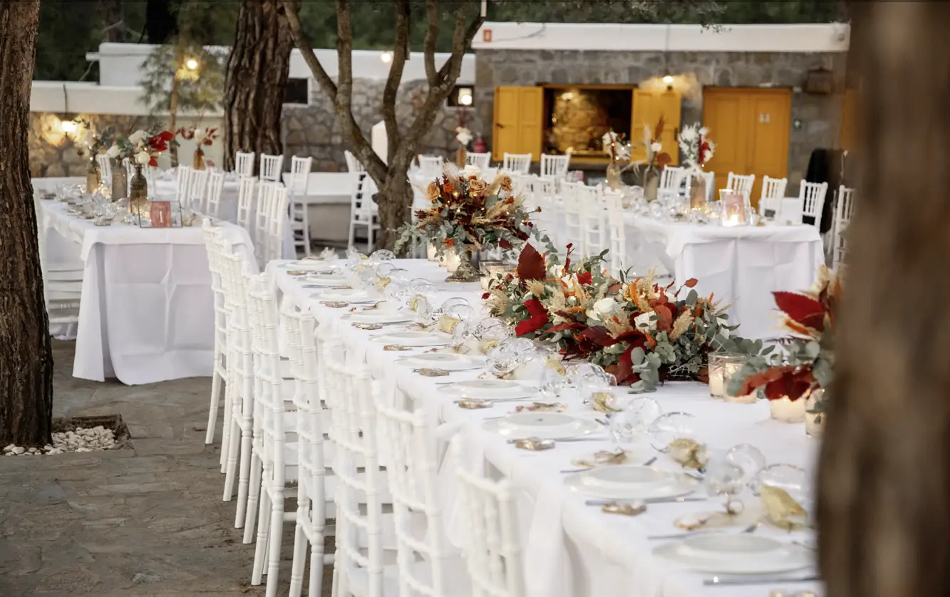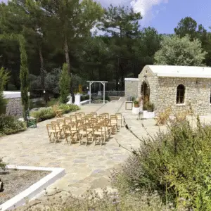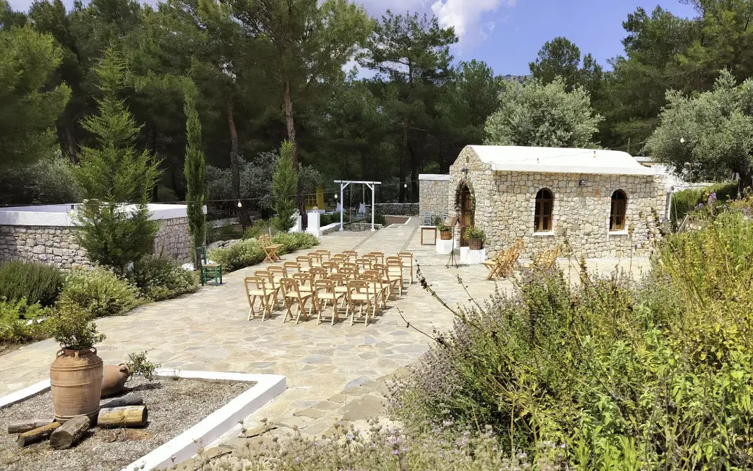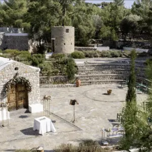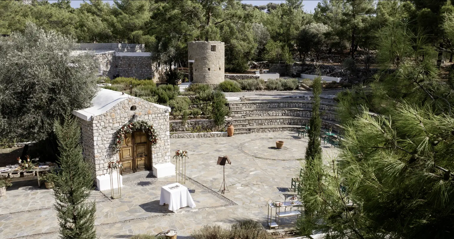 Kaminari Village is an open-air wedding venue tucked away in a 30-acre pine forest near Lindos, Rhodes. Featuring a reconstructed stone “secret village” with traditional houses, a chapel, amphitheater, and outdoor oven, it blends rustic charm with natural beauty. Couples can prepare on-site in bridal and groom houses, say vows beneath towering trees, and dance under twinkling lights amidst olive groves