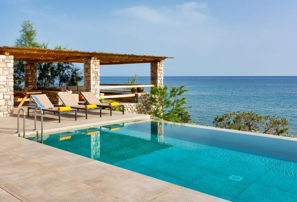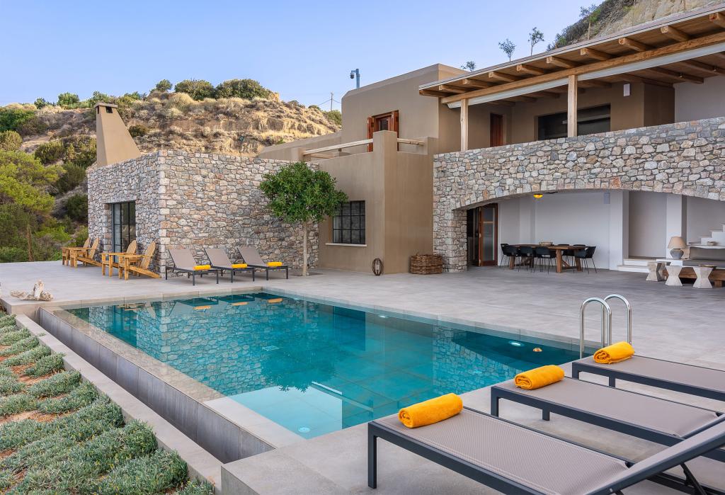 Set directly on the shores of the Libyan Sea, Villa Menta is a secluded beachfront venue on Crete’s south coast with sweeping sea views and total privacy. Hidden near the village of Arvi, it feels like your own private seaside retreat, perfect for an intimate destination wedding. The estate includes a main house, guesthouse and a separate seafront room, with 12 bedrooms sleeping up to 30 guests. Spacious interiors open onto four pergola covered terraces designed for relaxed outdoor living. Host long alfresco dinners, sunset drinks and beachside celebrations with built in lounges, outdoor kitchens and barbecues, including one right by the sea. Villa Menta offers a relaxed yet luxurious setting for a multi day wedding in Crete.